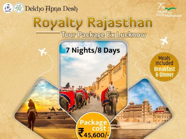 राजस्थान घूमने के लिए IRCTC की ओर से एक पैकेज निकाला गया है, जो 7 रात और 8 दिन के लिए है। इसके लिए बोर्डिंग प्वॉइंट लखनऊ एयरपोर्ट रखा गया है। ऐसे में अगर लखनऊ या आसपास के शहरों में रहते हैं तो ये पैकेज आपके लिए काफी अच्छा साबित होने वाला है। इस दौरान आप गुलाबी शहरों से लेकर झीलों की नगरी सब कुछ देख पाएंगे।