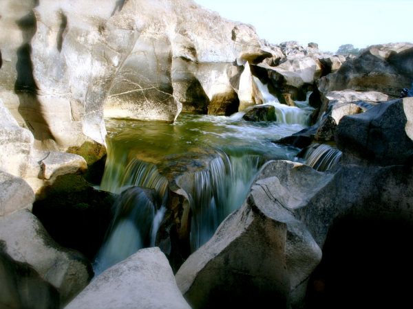 पत्थरों पर गढ्ढों की रचना करती हुई बहती नदी