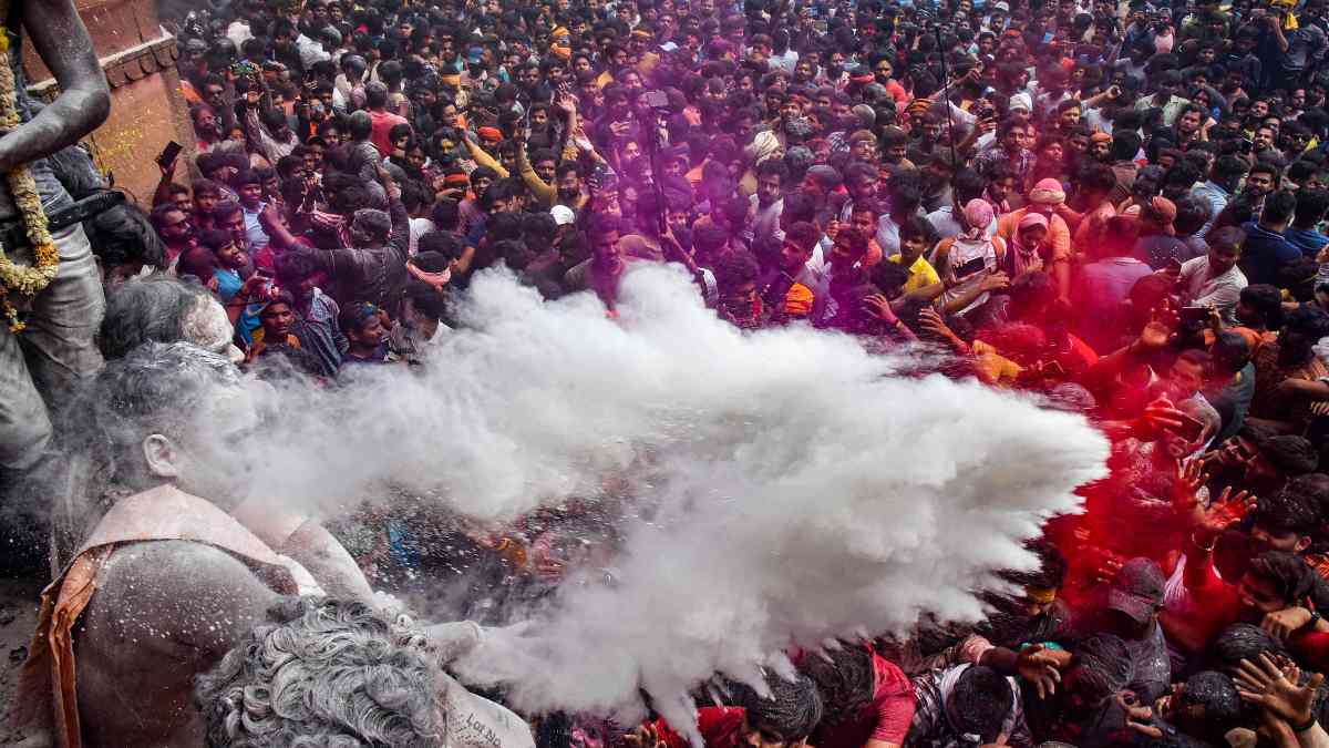 2. महादेव के भक्तों पर गुलाल की तरह भस्म उड़ाते नागा साधु।