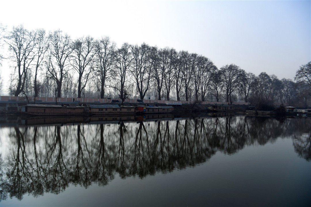 बर्फीले पहाड़ों की डल झील में पड़ती परछाई।
